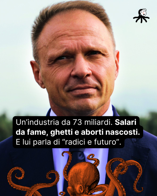 Un’industria da 73 miliardi. Salari da fame, ghetti e aborti nascosti. E lui parla di “radici e futuro”.