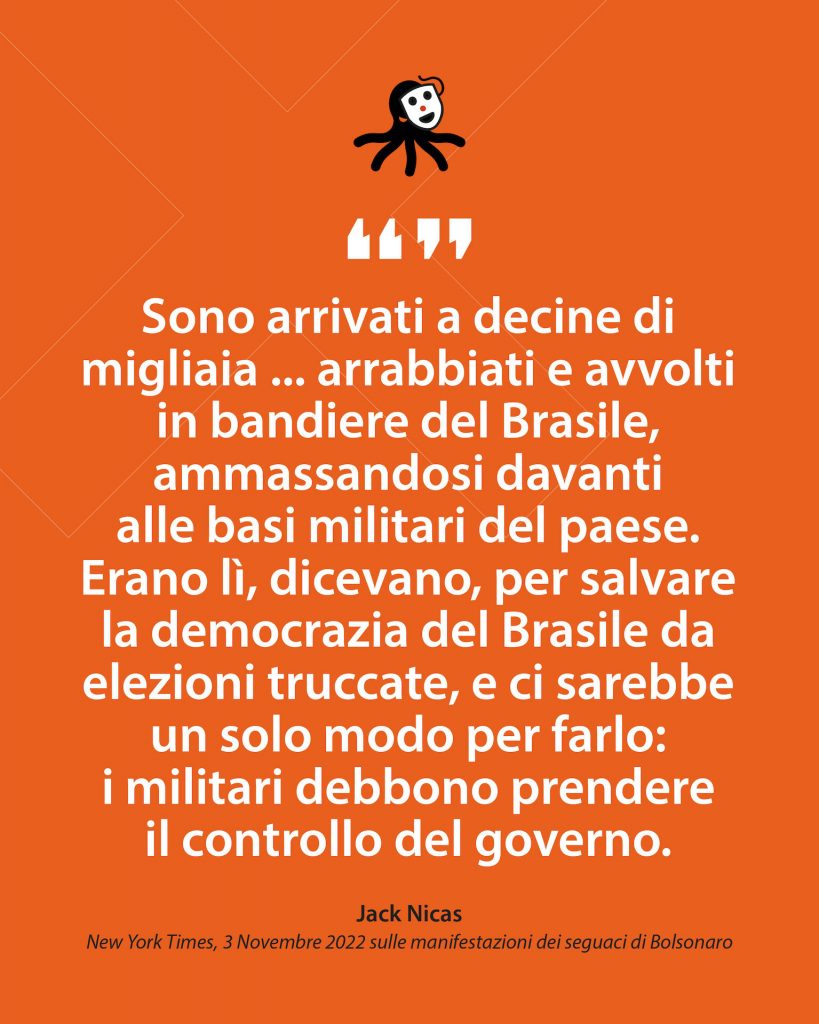 Trump fa scuola. Nonostante una valanga di fake news sui social, un diluvio di soldi in pubblicità e organizzazione di raduni, aggressioni agli avversari, la regola è questa: se perdi le elezioni (per due milioni di voti, in Brasile) allora le elezioni non sono valide e invochi il colpo di stato. La destra che si sta affermando nel mondo è di questo tipo. Fecero così anche i fascisti con la loro marcia su Roma e trovarono un re e un apparato di polizia che disse loro “accomodatevi”. Stiamo attenti.