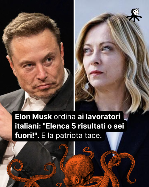 Elon Musk ordina ai lavoratori italiani: “Elenca 5 risultati o sei fuori!”. E la patriota tace.