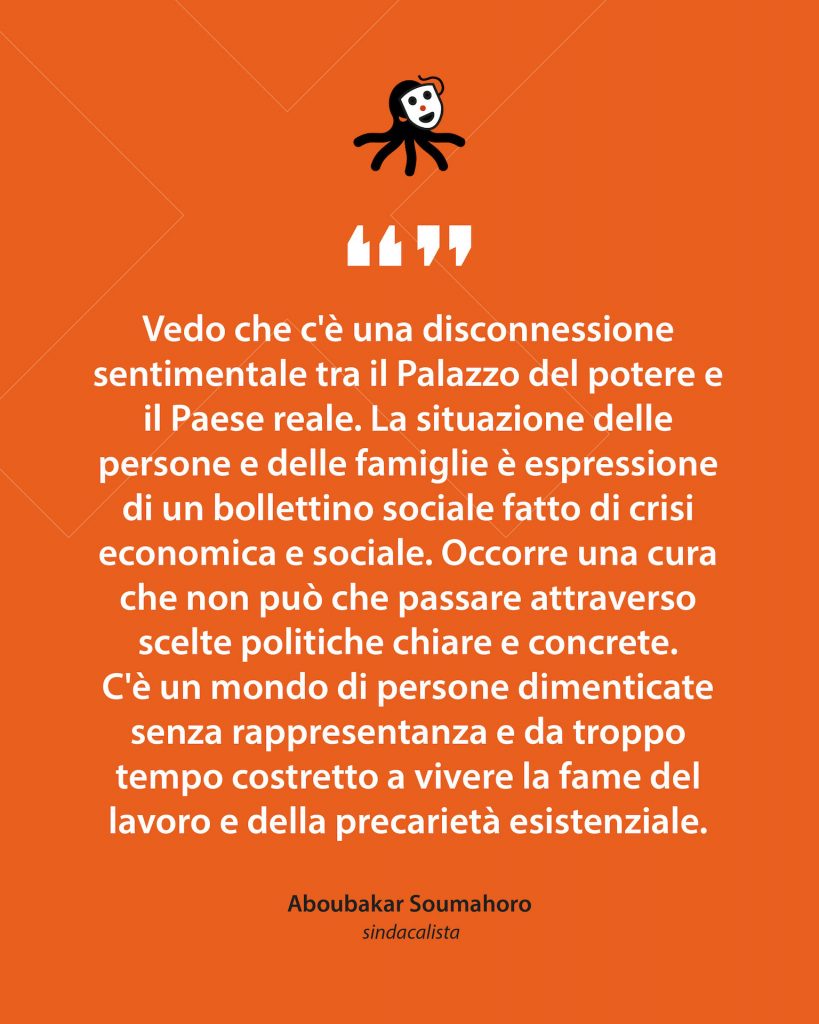 Fonte: ANSA, 12 luglio 2022. A proposito di “salario minimo”… Suhamoro è un sindacalista ivoriano naturalizzato italiano, laureato in sociologia a Napoli, da anni lotta per i diritti dei lavoratori, in particolare per la tutela dei diritti dei braccianti, della lotta al caporalato e allo sfruttamento che avviene lungo la filiera agricola.