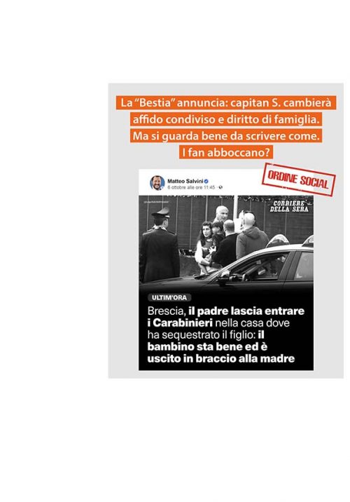 1) Il personaggio di S. ha il cuore d’oro, “Bene che il bimbo sia sano e salvo!”, peccato che a scrivere non sia S., ma il social media manager di turno, i fan abboccano: “Aiutate quel papà, il piccolo ha bisogno pure di lui! Le assistenti sociali rovinano le famiglie! Hai ragione Salvini!”