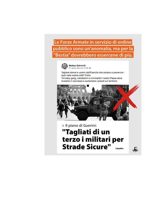 Il signor S. è stato Ministro dell’Interno e sfoggia sui social innumerevoli post di elogio alle Forze Armate. Ma non sembra avere capito la diversità di compiti e pur di attaccare il governo (di cui fa parte) sostiene che l’Esercito Italiano dovrebbe occuparsi di “baby gang, clandestini e criminalità”.