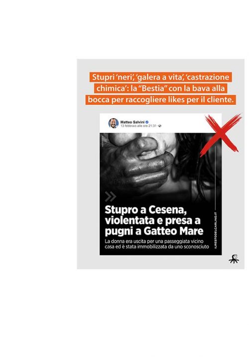 – L’immagine finta (di repertorio?) mostra una mano nera su viso bianco. L’aggressore scelto dalla “Bestia” era probabilmente ‘nero’ (fonte: Il Resto del Carlino – Cesena, 13 febbraio 2022), ma restando da quelle parti (Cesenatico) nessun post del signor S. per uno stupratore seriale ‘bianco’ (fonte: Giacomo Mascellani, Il resto del Carlino – Cesena, 17 agosto 2021). Così come niente post dedicato all’ottantenne “originario di Sarsina (prov. Forlì-Cesena ndr.), 80 anni, è stato arrestato per omicidio. L’anziano è accusato di aver ucciso il giorno di Natale la moglie” perché “Non voleva fare sesso” (fonte: Cesena Today, 28 dicembre 2021).