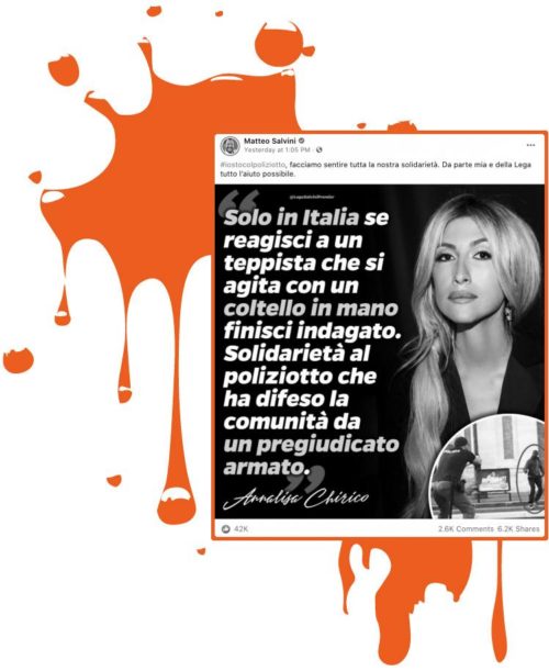 “Il ricorso alle armi o ad altro mezzo di coazione è giustificato, alla luce di quanto statuito dall’art. 53 c.p. […] l’ordinamento giuridico richiede che la condotta del pubblico ufficiale sia posta in essere al fine di opporsi ad una violenza o di vincere una resistenza all’autorità o, ancora, per impedire la consumazione di una serie di reati particolarmente gravi” (fonte: Dott. Chiechi Francesco, Diritto.it, 10 luglio 2018). In qualunque paese democratico il poliziotto che apre il fuoco quando non è ovvio che non aveva alternative sarebbe sempre  indagato dalla polizia stessa e dalla magistratura. Indagato non vuole dire condannato, ma soggetto a una verifica di legalità. “Solo in Italia…” Ma una giornalista non dovrebbe informarsi prima di esprimersi? Ha verificato in quanti paesi del mondo ci sono norme che regolano l’uso delle armi da fuoco da parte della polizia e quanti indagini ogni anno derivano da situazione come quella? O la giornalista vuole dire che il poliziotto che spara ha sempre e comunque ragione? Lo decide lei? Ma l’ex ministro dell’Interno pubblica la giornalista come propria autorevole testimonial…