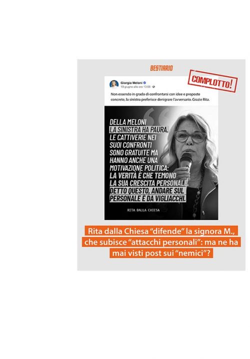 Secondo la testimonial Rita dalla Chiesa, la signora M. sarebbe vittima di attacchi personali da parte de “la sinistra” (entità mistica spesso evoca sui social delle “Bestie”). Rita dalla Chiesa? Alcuni estratti dal suo CV