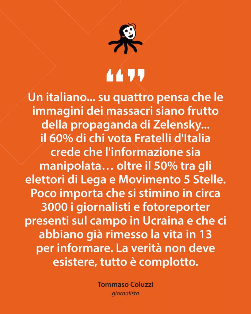 home > NEMICI E COMPLOTTI > La verità non deve esistere. È tutto un complotto Smask 13 Maggio Fonti: Tommaso Coluzzi, fanpage.it, 19 aprile 2022 su dati Demopolis; Jeyhun Aliyev, AA.com, 4 aprile 2022