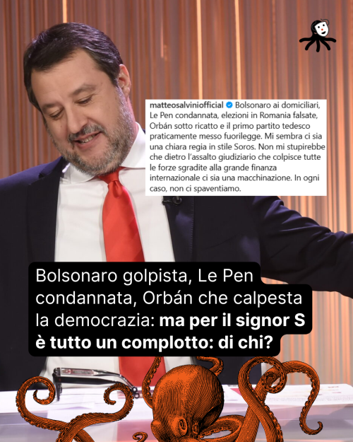 “Bolsonaro ai domiciliari, Le Pen condannata, elezioni in Romania falsate, Orbán sotto ricatto e il primo partito tedesco praticamente messo fuorilegge. Mi sembra ci sia una chiara regia in stile Soros. Non mi stupirebbe che dietro l’assalto giudiziario che colpisce tutte le forze sgradite alla grande finanza internazionale ci sia una macchinazione. In ogni caso, non ci spaventiamo”.