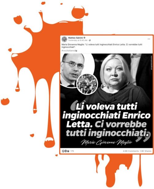 La cosiddetta “Bestia” ha colto al volo una frase del segretario del Partito Democratico sulla opportunità che gli Azzurri facessero il gesto contro il razzismo compiuto altrove da altri atleti. Certi gesti o sono spontanei ed al momento giusto o finiscono nel nulla o nella polemica. Abbiamo contato diversi post al giorno sul tema sui social del signor S. Ma fra tutti i post di attacco a Letta da parte della cosiddetta “Bestia” ecco il volo pindarico della testimonial Giovanni Maglie: dalla proposta alla squadra di inginocchiarsi, ecco che “ci vorrebbe tutti inginocchiati”.