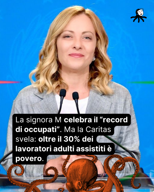 La signora M celebra il “record di occupati”. Ma la Caritas svela: oltre il 30% dei lavoratori adulti assistiti è povero.