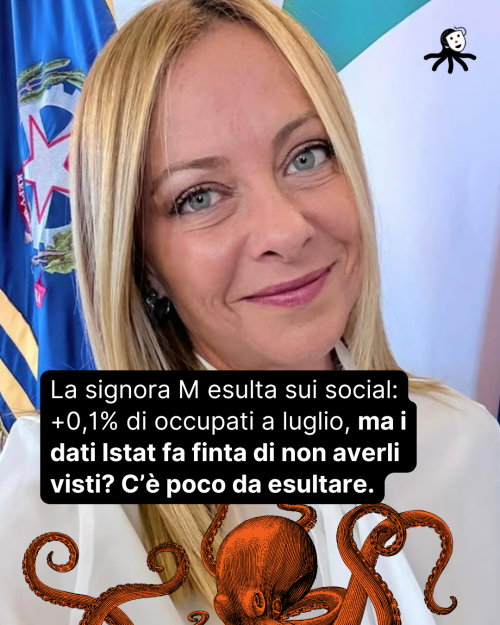 La signora M parla sui social di “segnali positivi dal mondo del lavoro”: il tasso di occupazione “sale al 62,8%” e quello di disoccupazione “scende al 6%”. Ci tiene a ricordarci i “218mila occupati in più” rispetto a luglio 2024, soprattutto “grazie ai contratti a tempo indeterminato”.