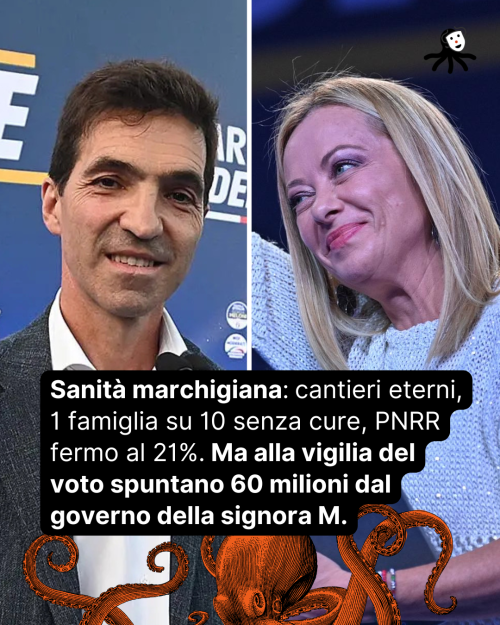 E i fondi del PNRR? Congelati. Su oltre 430 milioni, la Regione ne ha spesi appena il 21%. Ad Ancona, per le Case della Comunità, il 5,5%. A San Benedetto l’1,7%. Poi però si organizzano tagli di nastro e foto davanti alle gru.